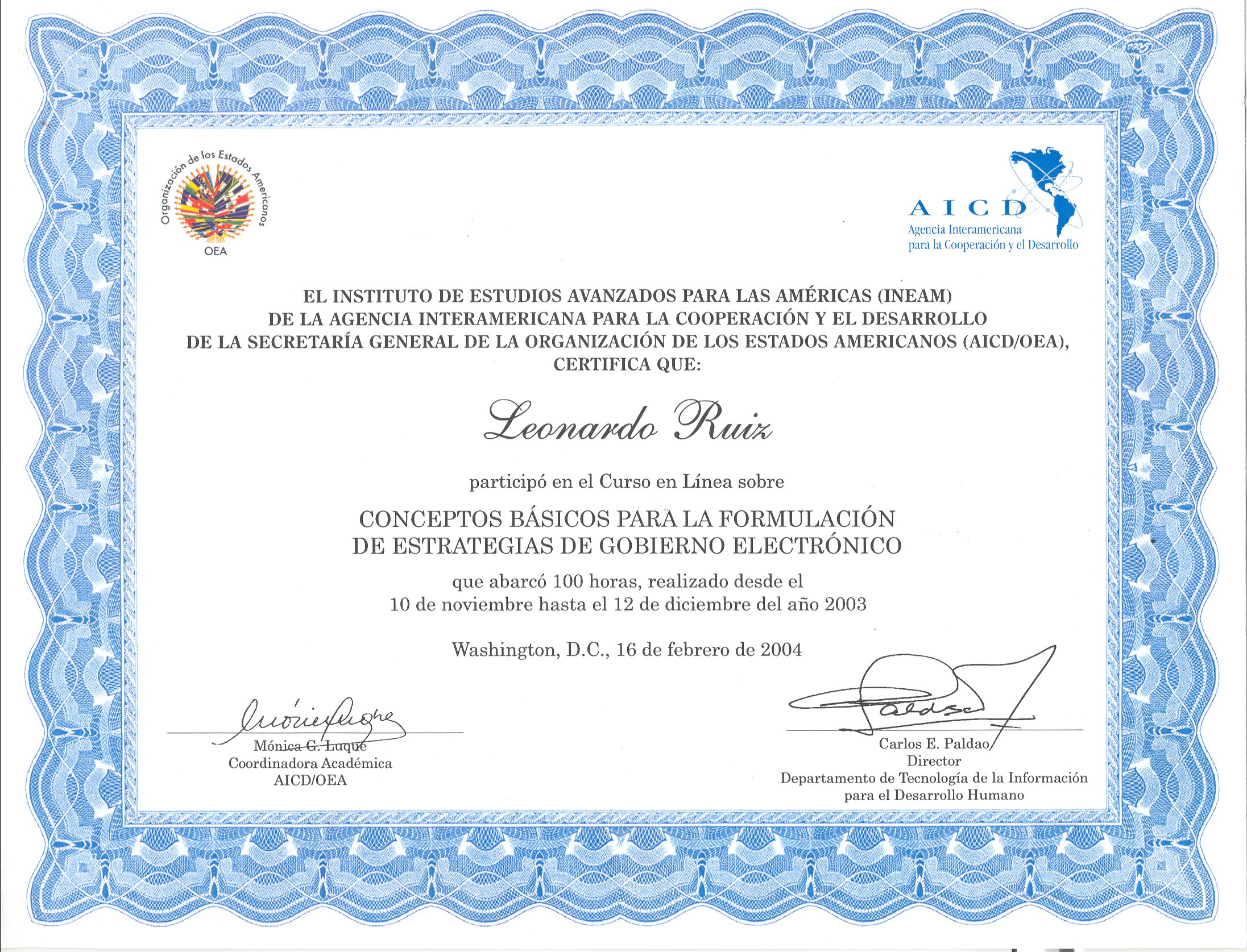 CURSO: CONCEPTOS BÁSICOS PARA LA FORMULACIÓN DE ESTRATEGIAS DE GOBIERNO ELECTRÓNICO INSTITUTO DE ESTUDIOS AVANZANDOS PARA LAS AMÉRICAS (INEAM) DE LA AGENCIA INTERAMERICANA PARA LA COOPERACIÓN Y EL DESARROLLO DE LA SECRETARÍA GENERAL DE LA ORGANIZACIÓN DE LOS ESTADOS AMERICANOS (AICD/OEA) | Virtual | Certificado |