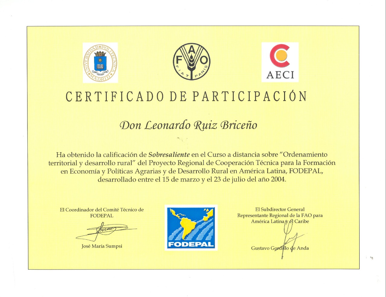 CURSO: Ordenamiento Territorial y Desarrollo Rural FODEPAL - Proyecto Regional de Cooperación Técnica para la Formación en Economía y Políticas Agrarias y de Desarrollo Rural en América Latina - FAO / AECI / Universidad Politécnica de Madríd, España |
