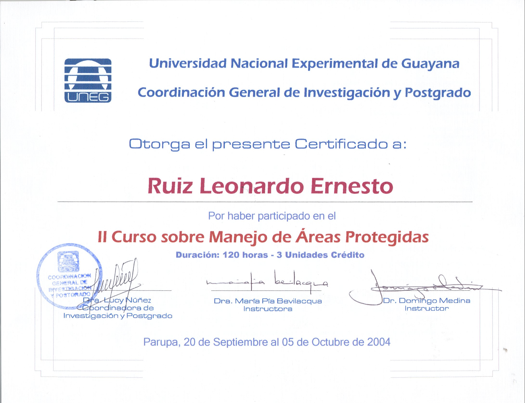 II CURSO SOBRE MANEJO DE ÁREAS PROTEGIDAS Coordinación General de Investigación y Postgrado - Universidad Nacional Experimental de Guayana |