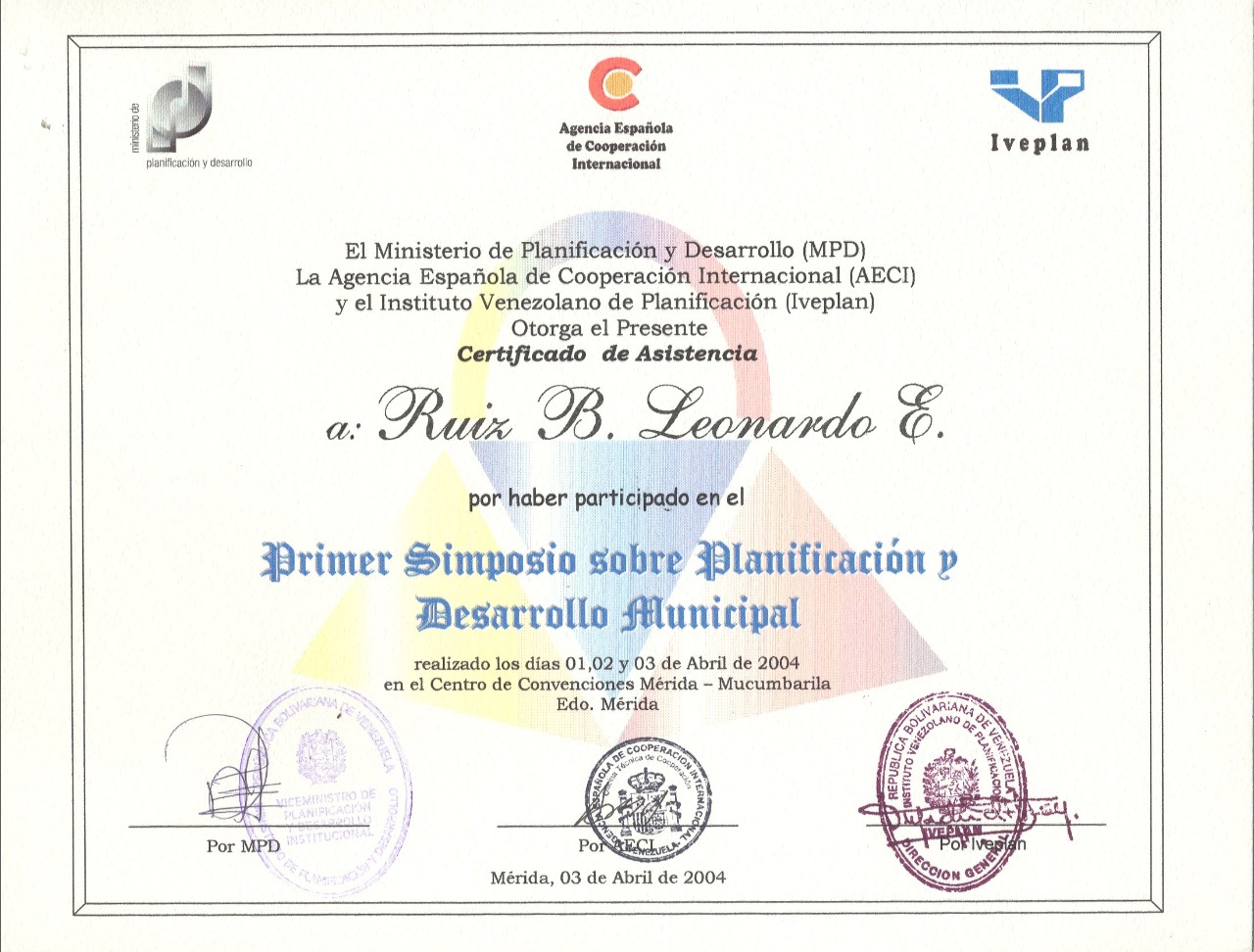 PRIMER SIMPOSIO SOBRE PLANIFICACIÓN Y DESARROLLO MUNICIPAL MPD - Ministerio de planificación y Desarrollo, AECI (Agencia Española de Cooperación Internacional), IVEPLAN (Instituto Venezolano de Planificación) |