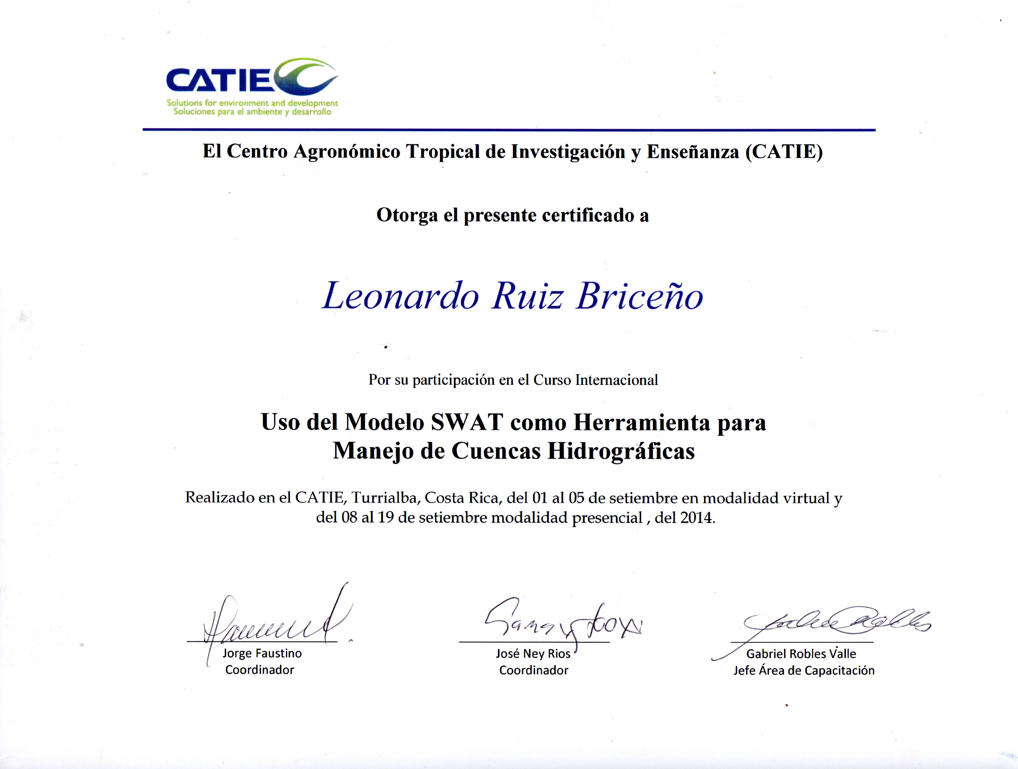 Curso: USO DEL MODELO SWAT COMO HERRAMIENTA PARA EL MANEJO DE CUENCAS HIDROGRÁFICAS CATIE-Centro Agronómico Tropical de Investigación y Enseñanza Turrialba; Costa Rica |