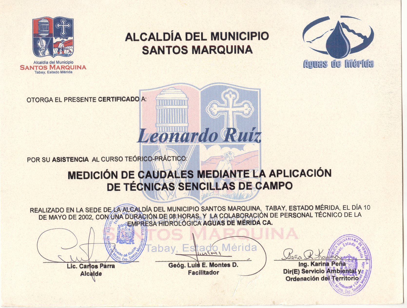 CURSO: Medición de Caudales mediante la aplicación de Técnicas sencillas de campo Alcaldía del Municipio Santos Marquina - Empresa pública: Aguas de Mérida - Estado Mérida, Venezuela |