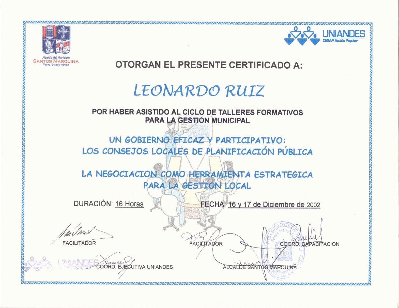CICLO DE TALLERES FORMATIVOS: Taller 1: Un Gobierno Eficaz y Participativo: Los Consejos Locales de Planificación Pública Taller 2: La Negociación como Herramienta Estratégica para la Gestión Local Alcaldía de Santos Marquina - UNIANDES - Estado Mérida - Venezuela |