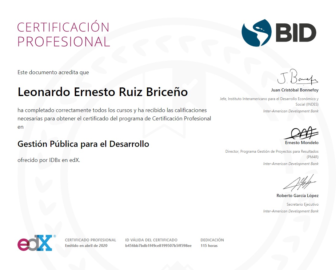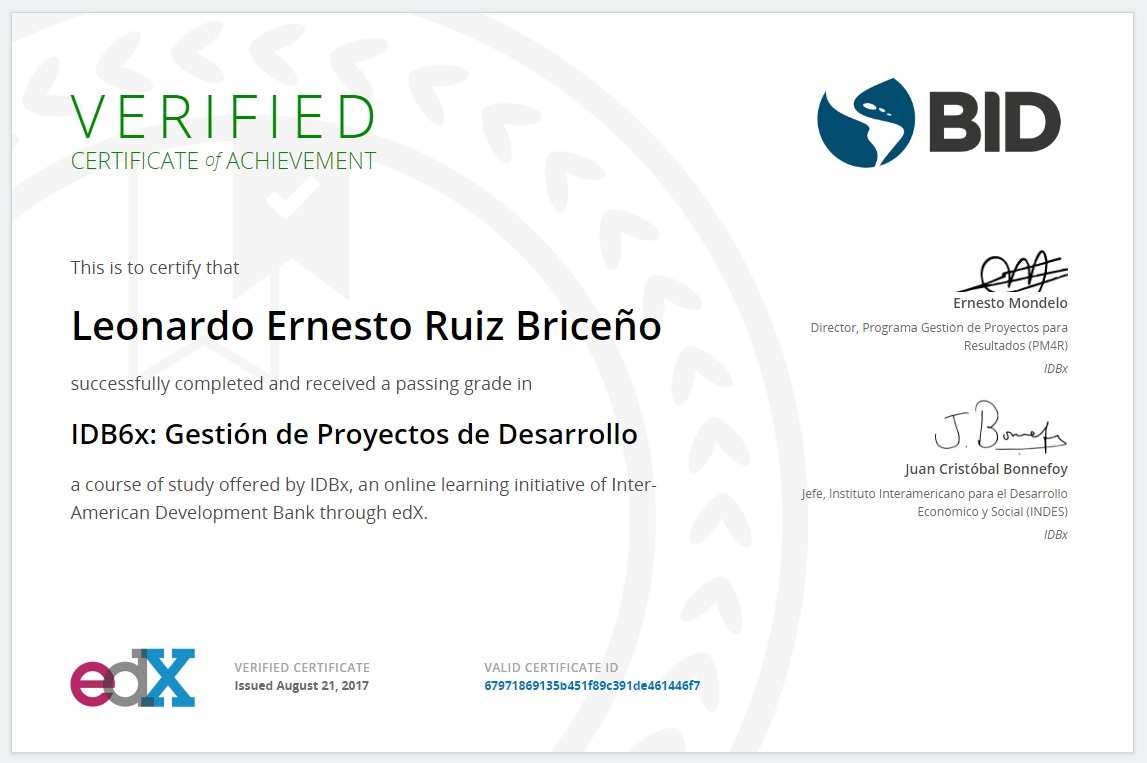 Curso edX: IDB6 - GESTIÓN DE PROYECTOS DE DESARROLLO BID-Banco Interamericano de Desarrollo INDES-Instituto Interamericano para el Desarrollo Económico y Social |