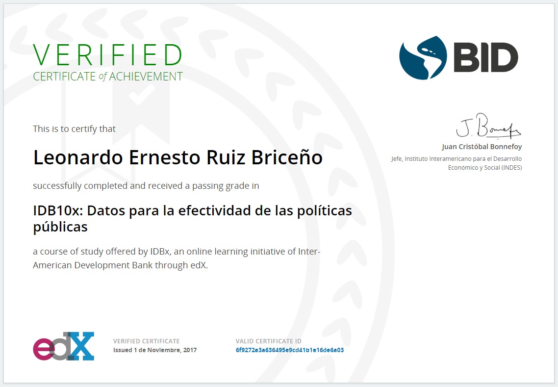 Curso: IDB10x - DATOLOGÍA: Datos para la efectividad de las políticas públicas BID-Banco Interamericano de Desarrollo INDES-Instituto Interamericano para el Desarrollo Económico y Social |