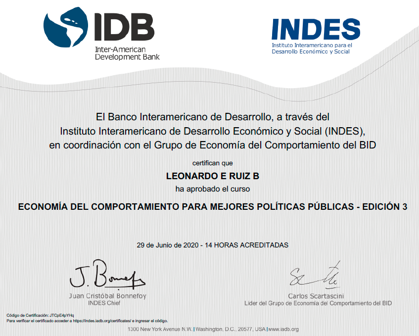 Curso: ECONOMÍA DEL COMPORTAMIENTO PARA MEJORES POLÍTICAS PÚBLICAS - EDICIÓN 3 BID-Banco Interamericano de Desarrollo INDES-Instituto Interamericano para el Desarrollo Económico y Social |